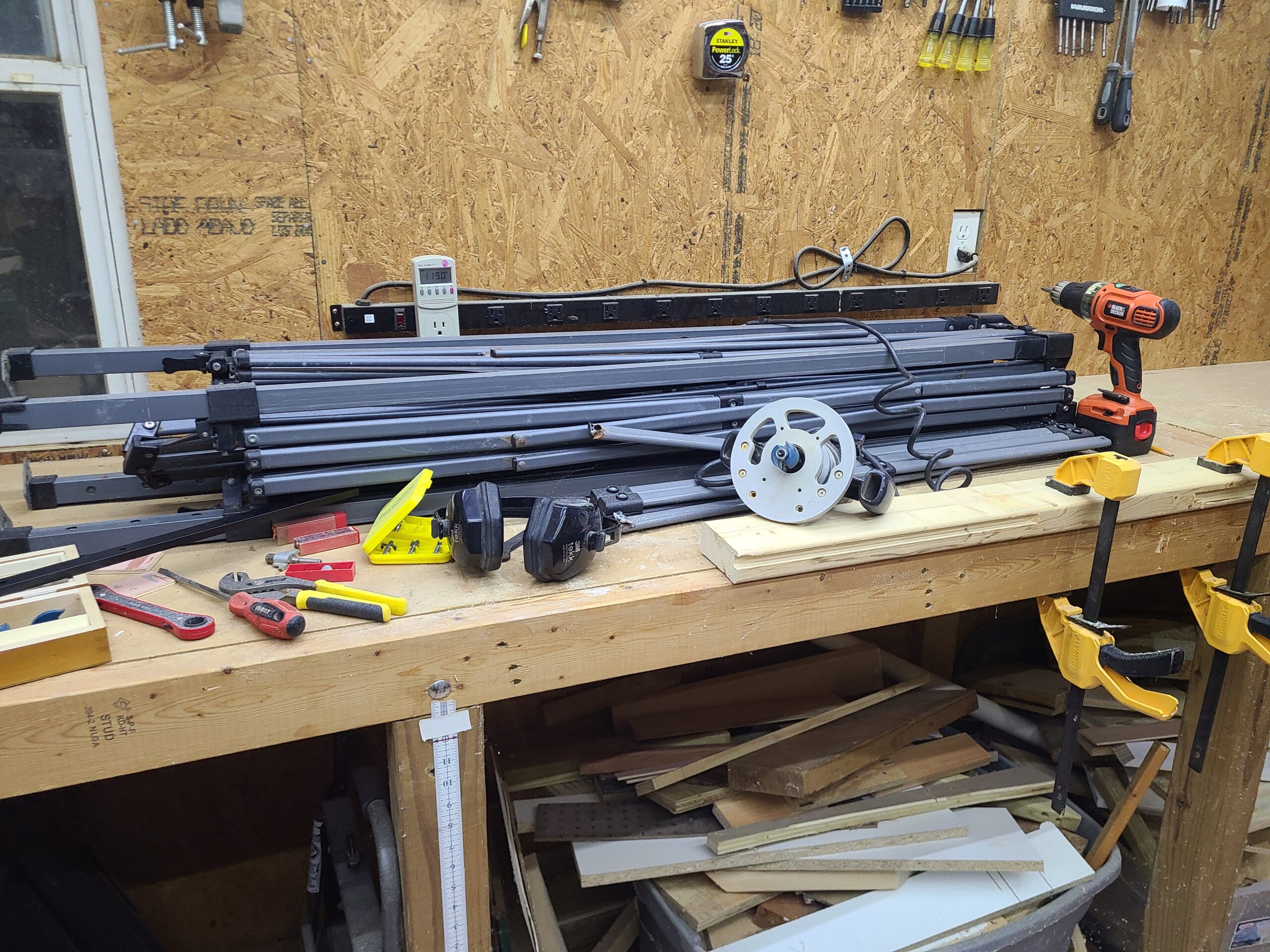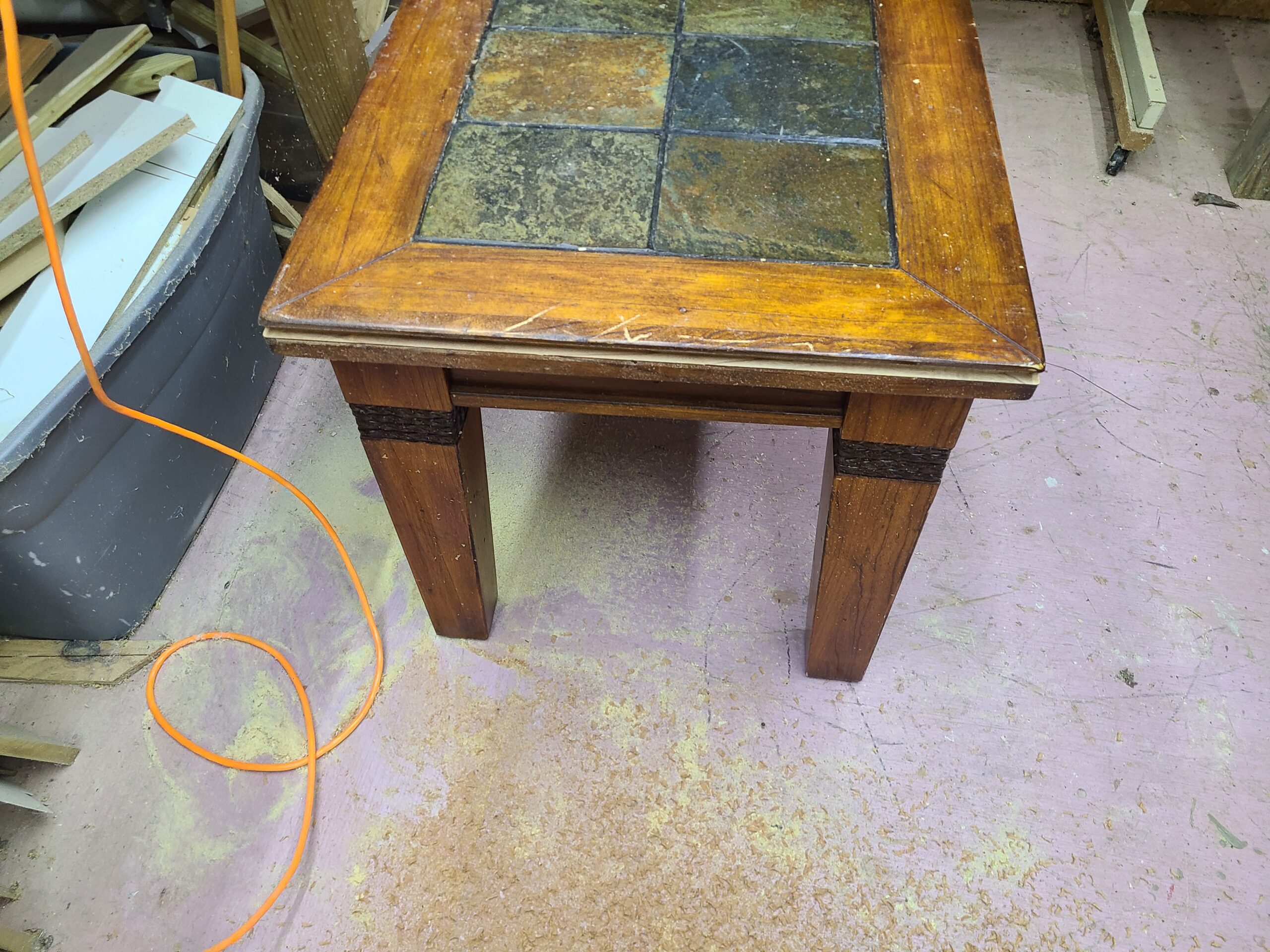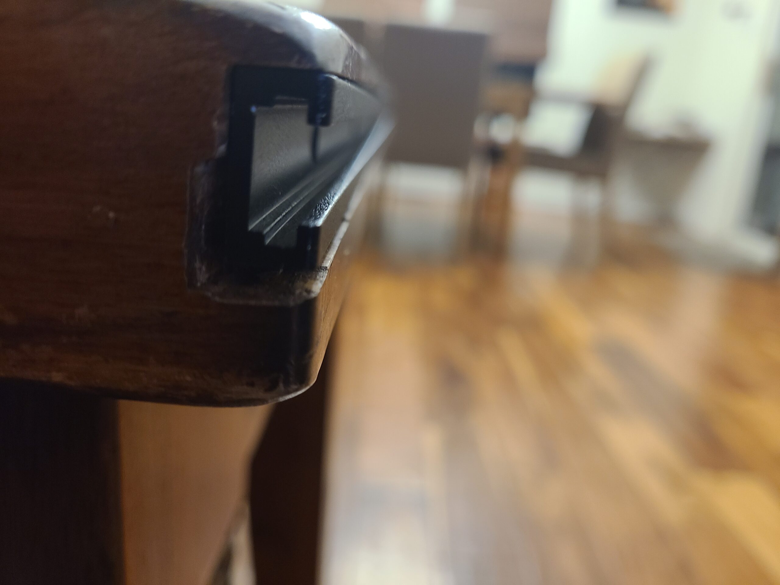 What I arrived at is based on 2ft of black aluminum T-track rail, the kind you’d have in a router table or something to hold a fence or work piece down. I got a cheap router from a thrift shop, and routed a channel into the existing side table, which is beefy wood and stone. I ran a little wood stain down the channel so there wouldn’t be any off-putting white wood peeking out, then screwed in the rail, fitting snug and flush.