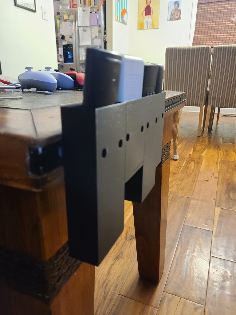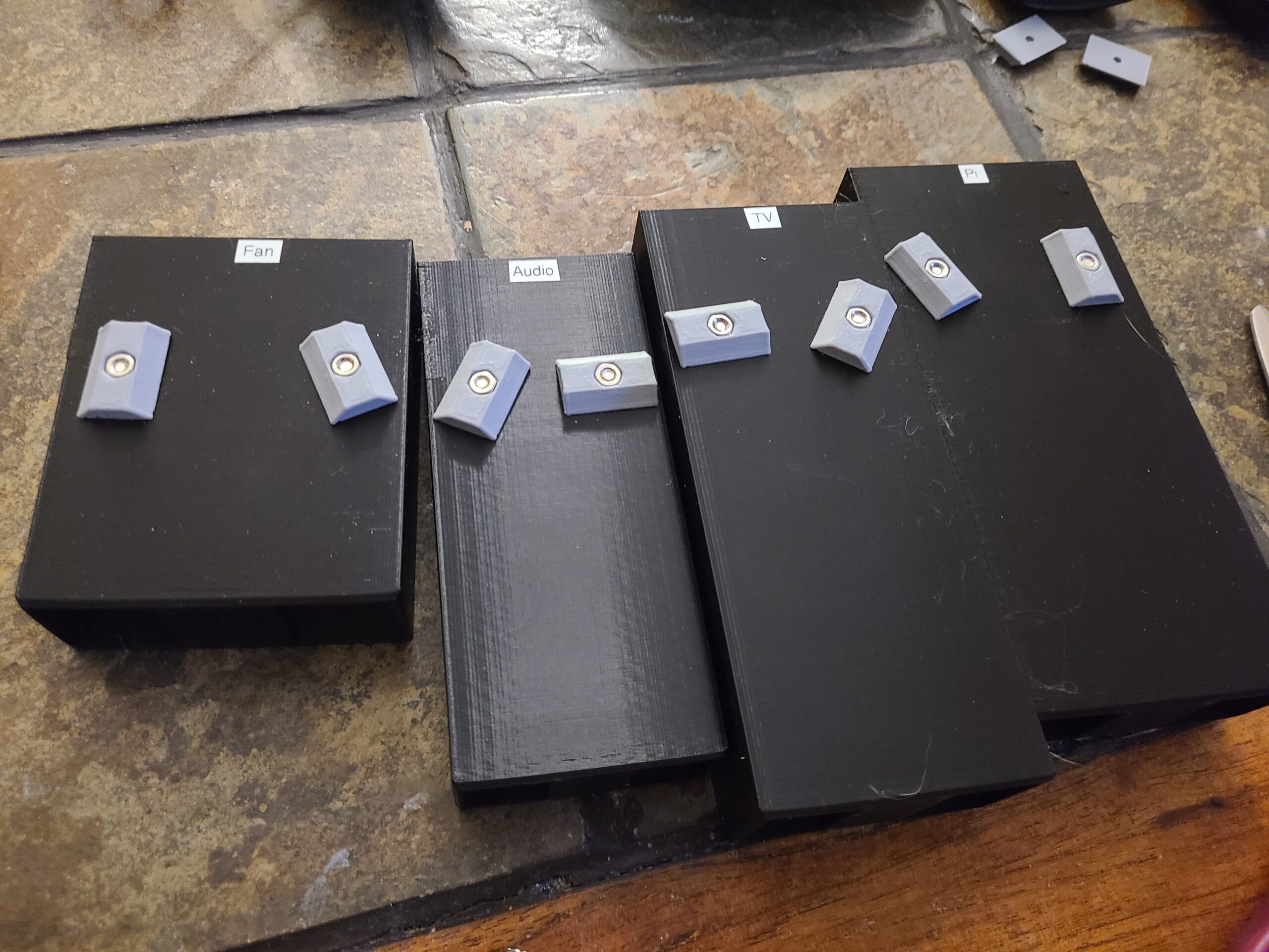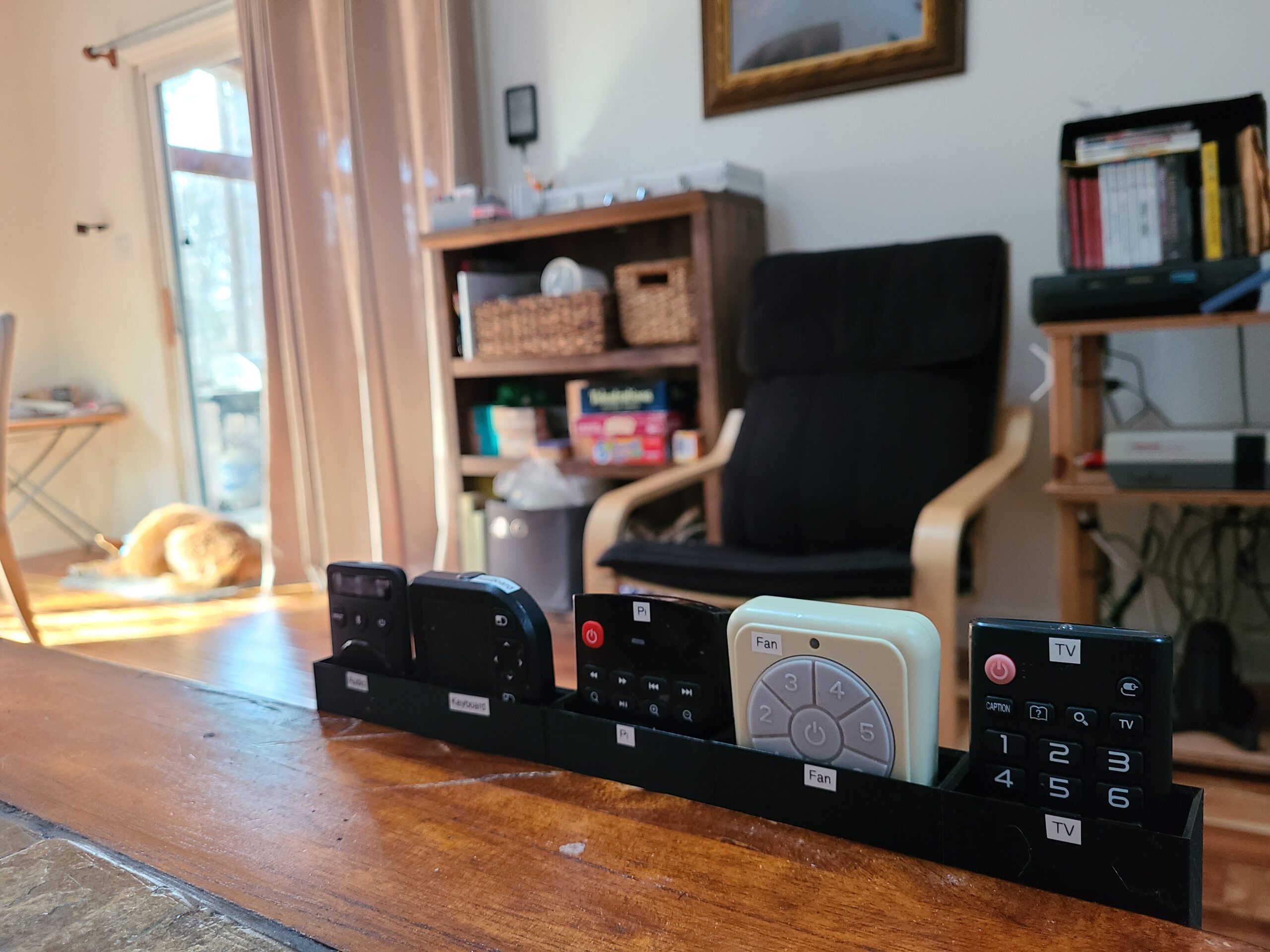 The CAD model (available here) is parametric and configured for the exact dimensions of each remote, so they all stick up to the exact same height, making for pleasing, easy access: